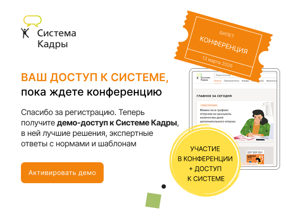 Подпишитесь на Telegram-бота для участников. Он будет присылать новости о конференции и подарки от главреда Системы Кадры: памятки по изменениям в 2026 году, кадровые формы, рабочие советы и проверенные промты для кадровика.